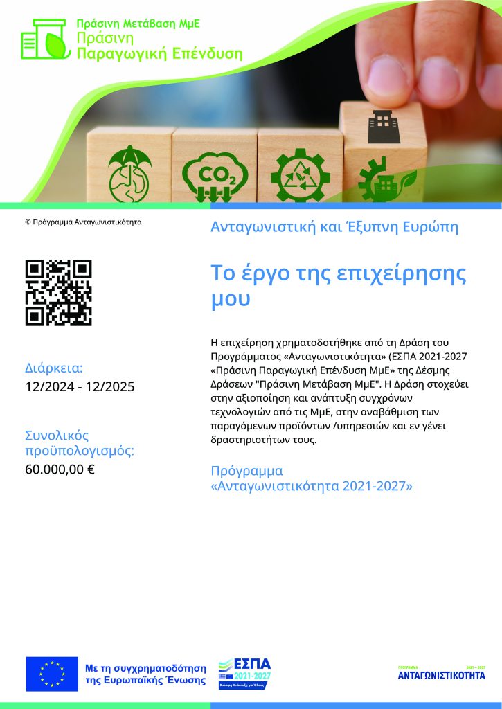 Η επιχείρηση χρηματοδοτήθηκε από τη Δράση του Προγράμματος «Ανταγωνιστικότητα» (ΕΣΠΑ 2021-2027) «Πράσινη Παραγωγική Επένδυση ΜμΕ» της Δέσμης Δράσεων «Πράσινη Μετάβαση ΜμΕ». Η Δράση στοχεύει στην αξιοποίηση και ανάπτυξη συγχρόνων τεχνολογιών από τις ΜμΕ, στην αναβάθμιση των παραγόμενων προϊόντων/υπηρεσιών και εν γένει δραστηριοτήτων τους.