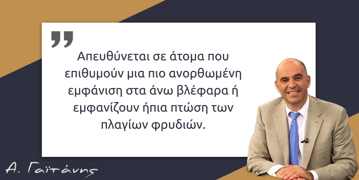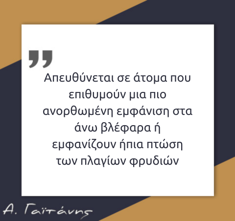 Απευθύνεται σε άτομα που επιθυμούν μια πιο ανορθωμένη εμφάνιση στα άνω βλέφαρα ή εμφανίζουν ήπια πτώση των πλαγίων φρυδιών. Οι κατάλληλοι υποψήφιοι έχουν καλή ελαστικότητα δέρματος και ρεαλιστικές προσδοκίες, ενώ ο Πλαστικός Χειρουργός αξιολογεί τη μορφολογία του προσώπου για να καθορίσει την κατάλληλη τεχνική.