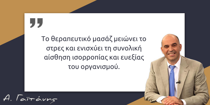 Εάν επιθυμείτε να απολαύσετε τα οφέλη του θεραπευτικού μασάζ και να αναζωογονήσετε το σώμα και το πνεύμα σας, επικοινωνήστε μαζί μας. Ο Πλαστικός Χειρουργός Δρ. Απόστολος Γαϊτάνης με την επιστημονική του κατάρτιση και τη σφαιρική του προσέγγιση στην αισθητική και τη φροντίδα του σώματος και η εξειδικευμένη ομάδα του προσφέρουν θεραπευτικό μασάζ προσαρμοσμένο στις ανάγκες κάθε ασθενούς.