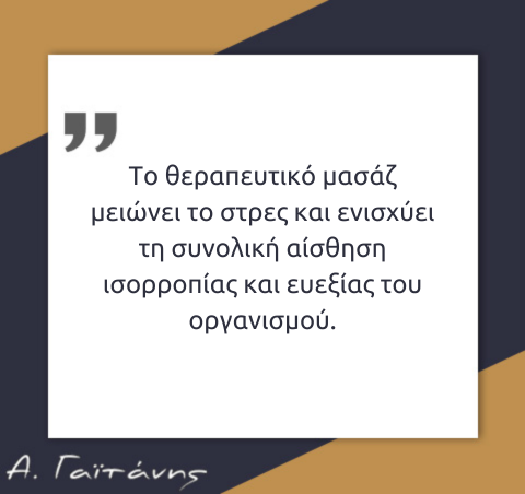 Παράλληλα, λειτουργεί ευεργετικά και στο επίπεδο της ψυχοσωματικής ευεξίας. Ειδικότερα, το θεραπευτικό μασάζ μειώνει το στρες και ενισχύει τη συνολική αίσθηση ισορροπίας και ευεξίας του οργανισμού.